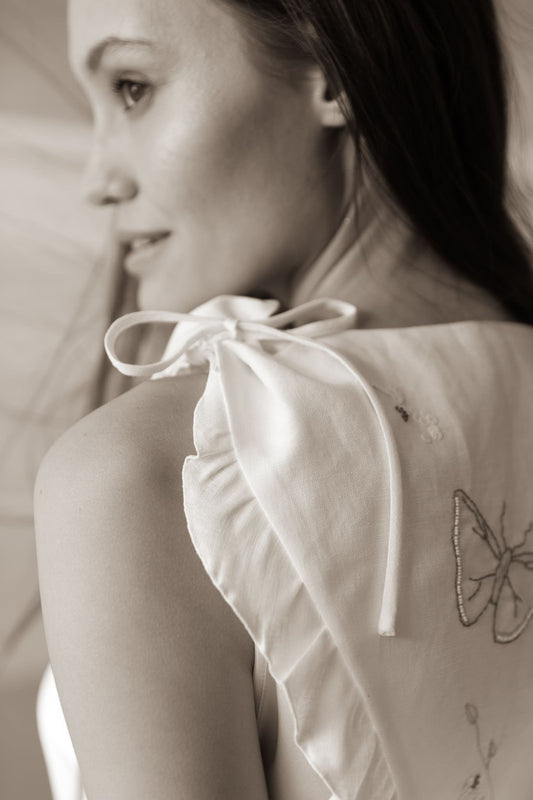 Creada en tejidos naturales como la seda, el algodón y el lino e incluyen por primera vez, bordados a mano. Los bordados son realizados pieza a pieza combinando bordado tradicional con la técnica Luneville.